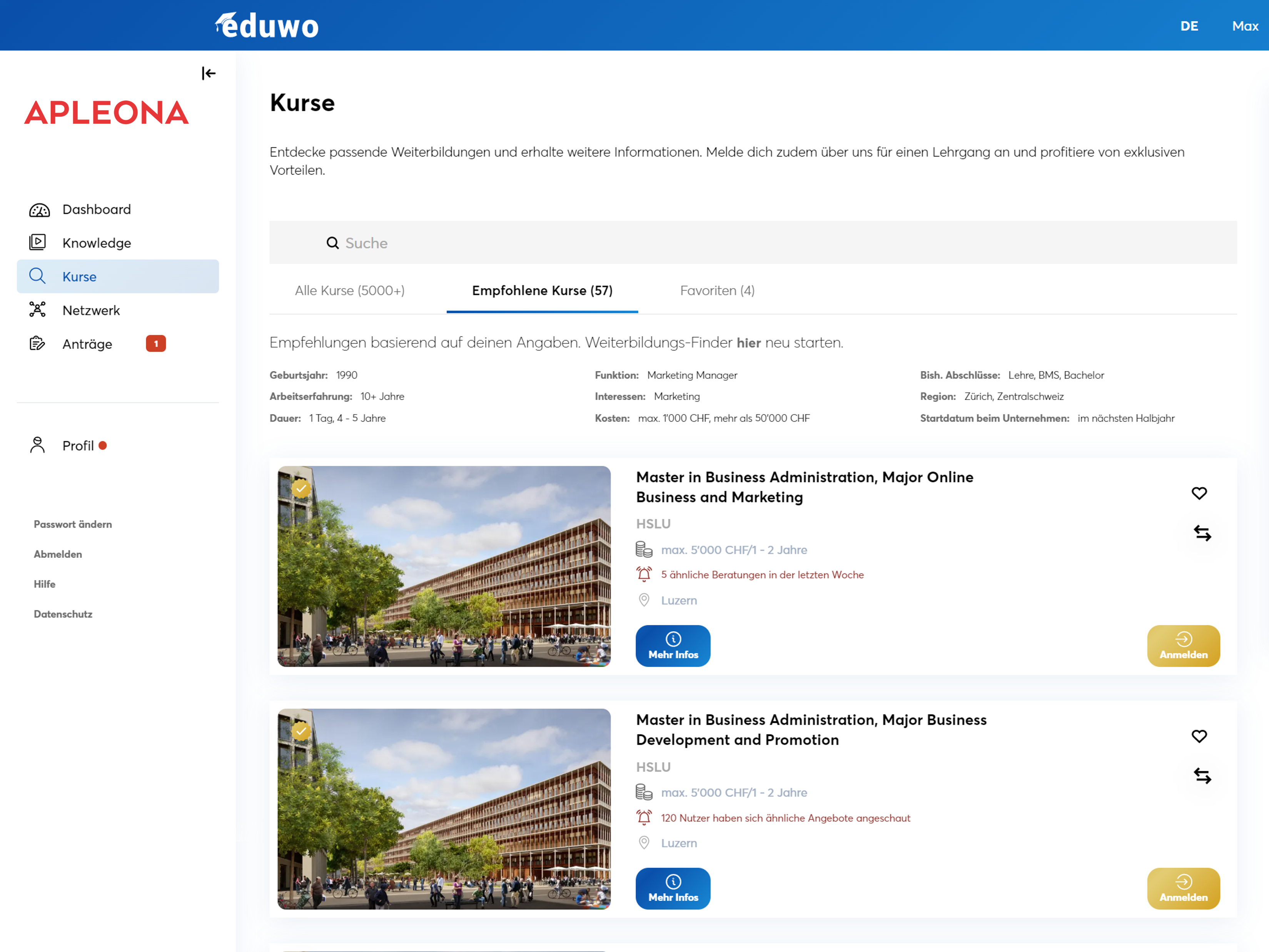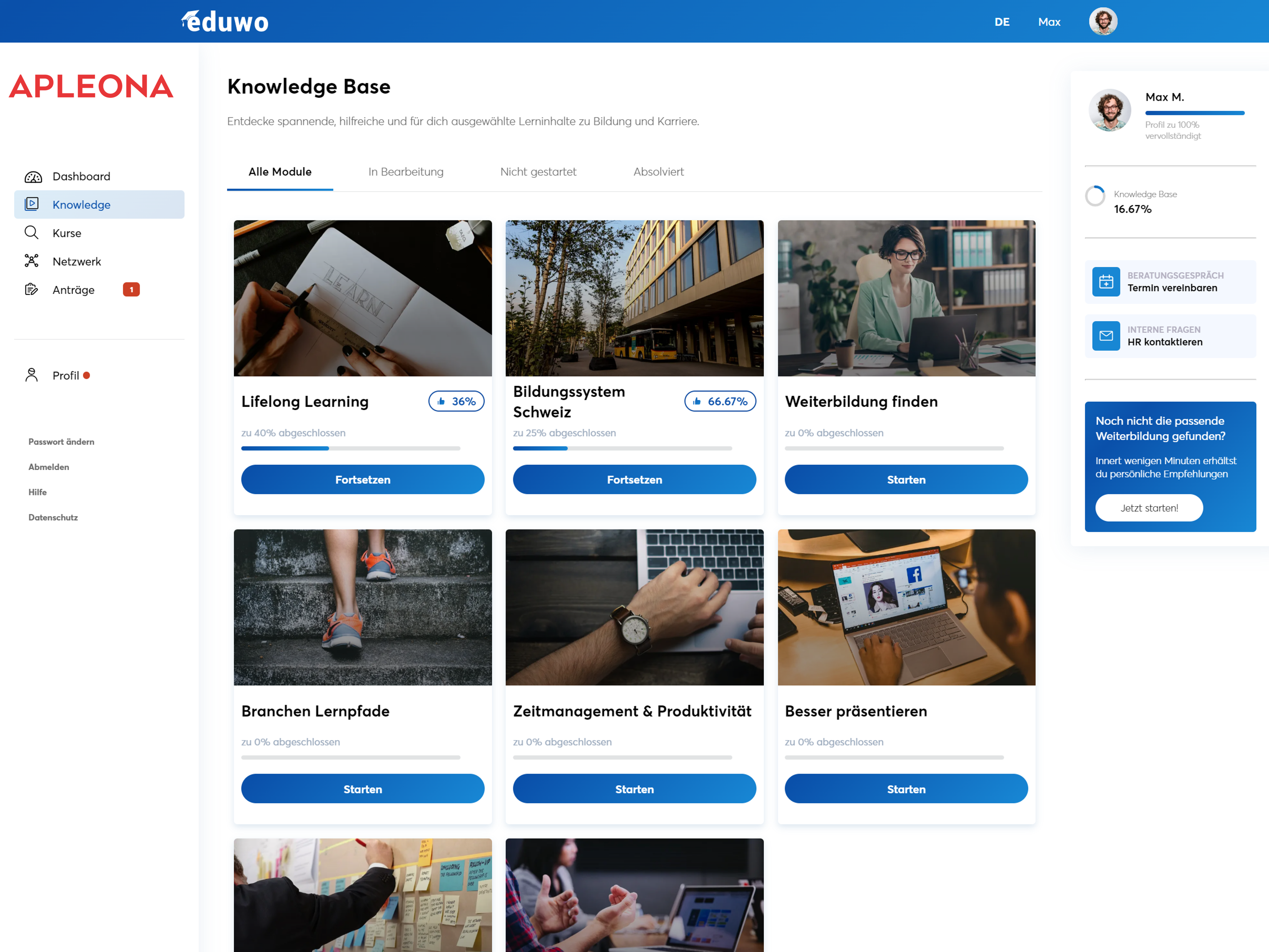 Entdecke Weiterbildungen in der Schweiz, buche über eduwo einen Lehrgang und profitiere als Apleona Mitarbeitender von exklusiven Vorteilen.